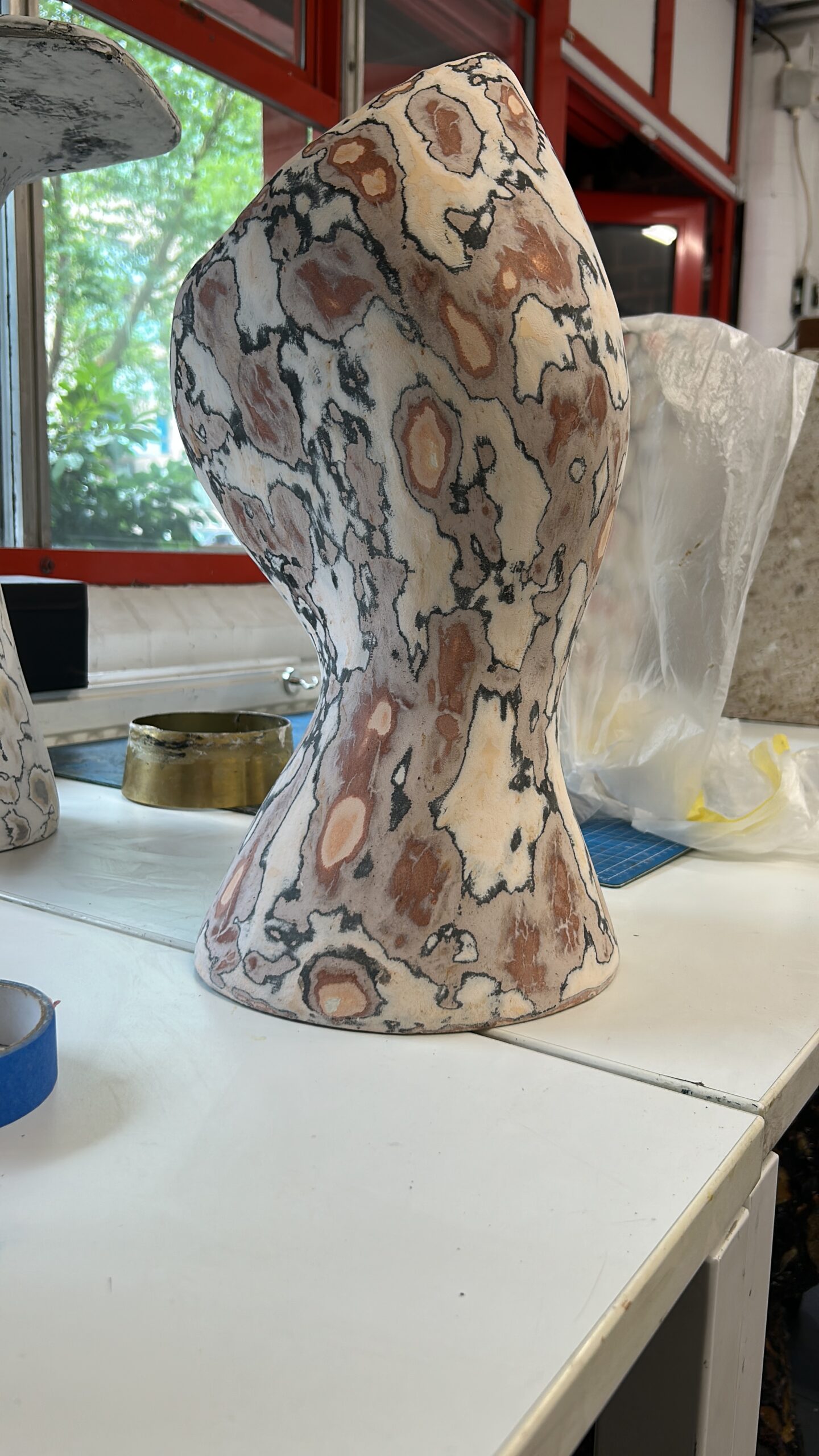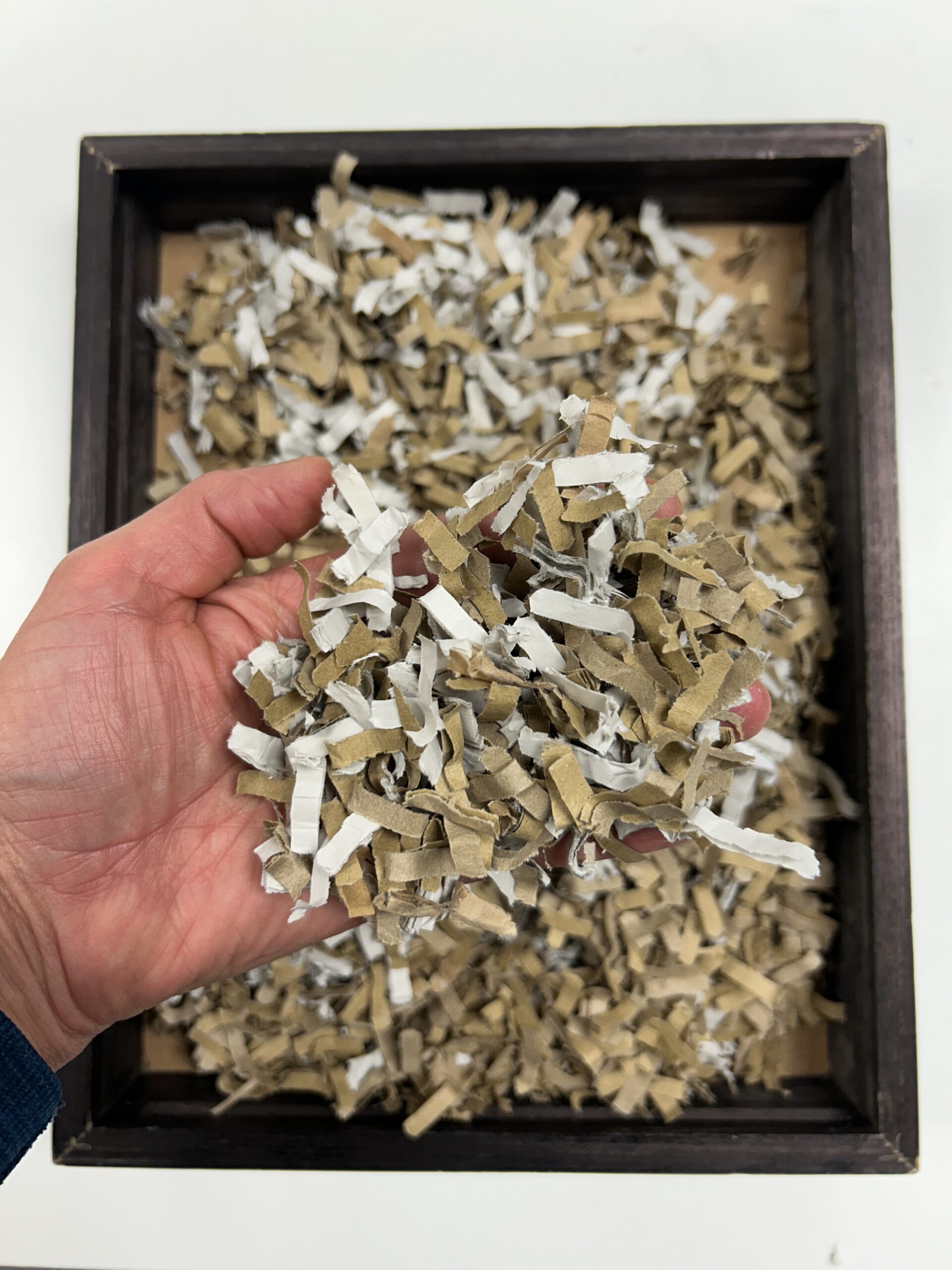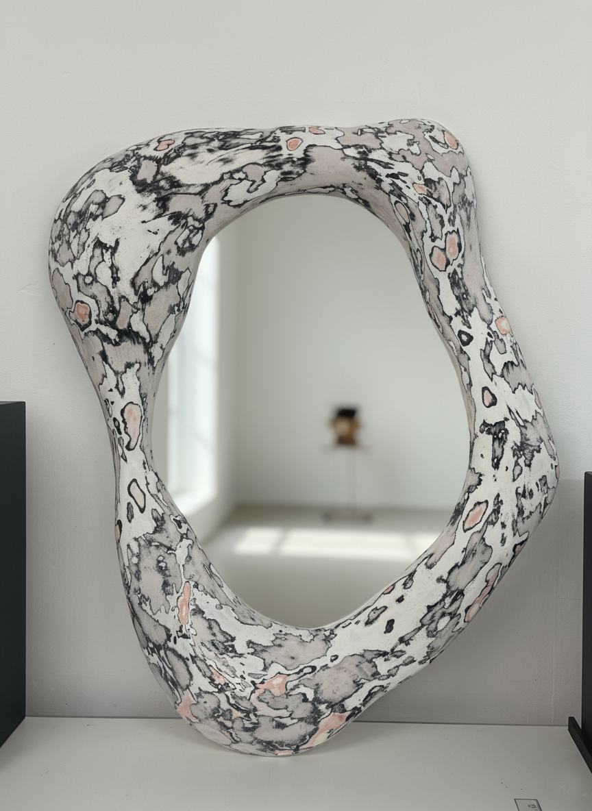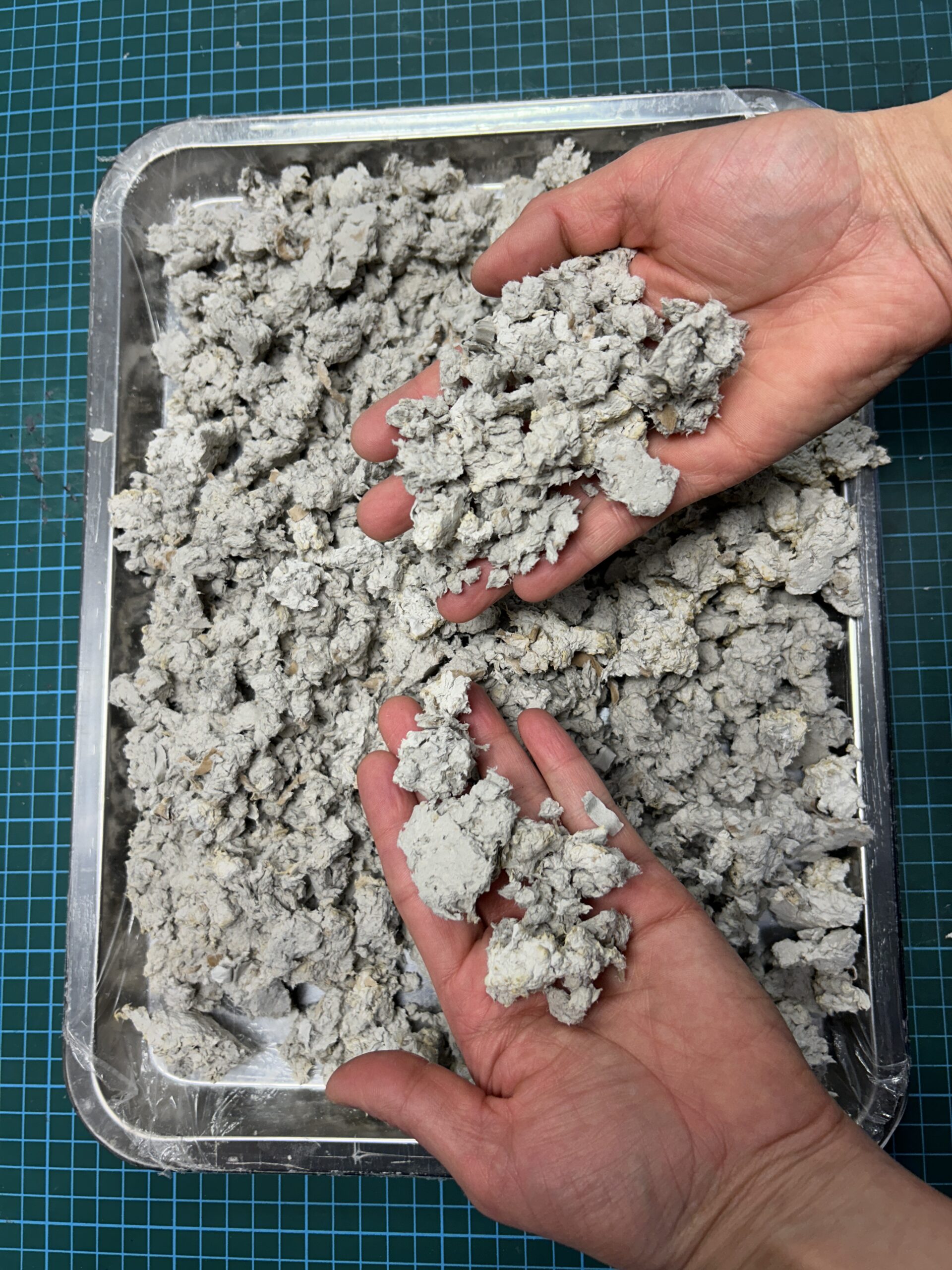 The process begins with sourcing waste paper from industrial and post-consumer streams. Once collected, the material is shredded and softened to remove impurities and prepare it for reformulation. The processed fibres are then combined with natural or biodegradable binders and shaped into a strong, versatile biocomposite used to sculpt the pieces.
