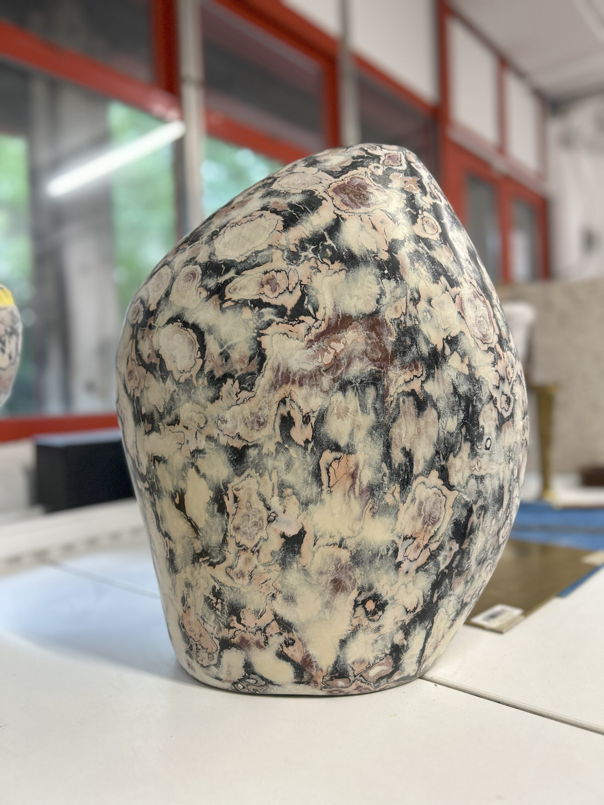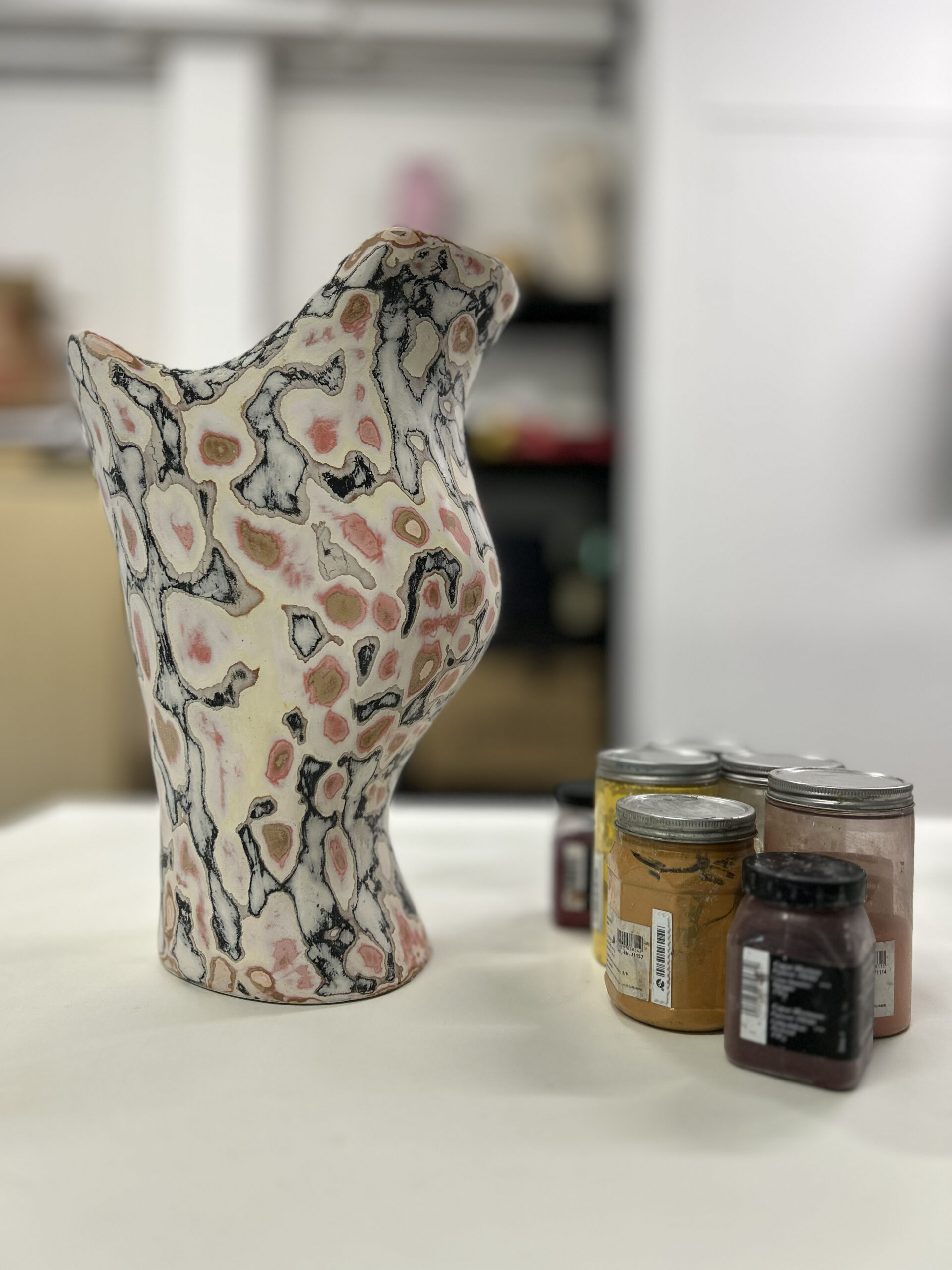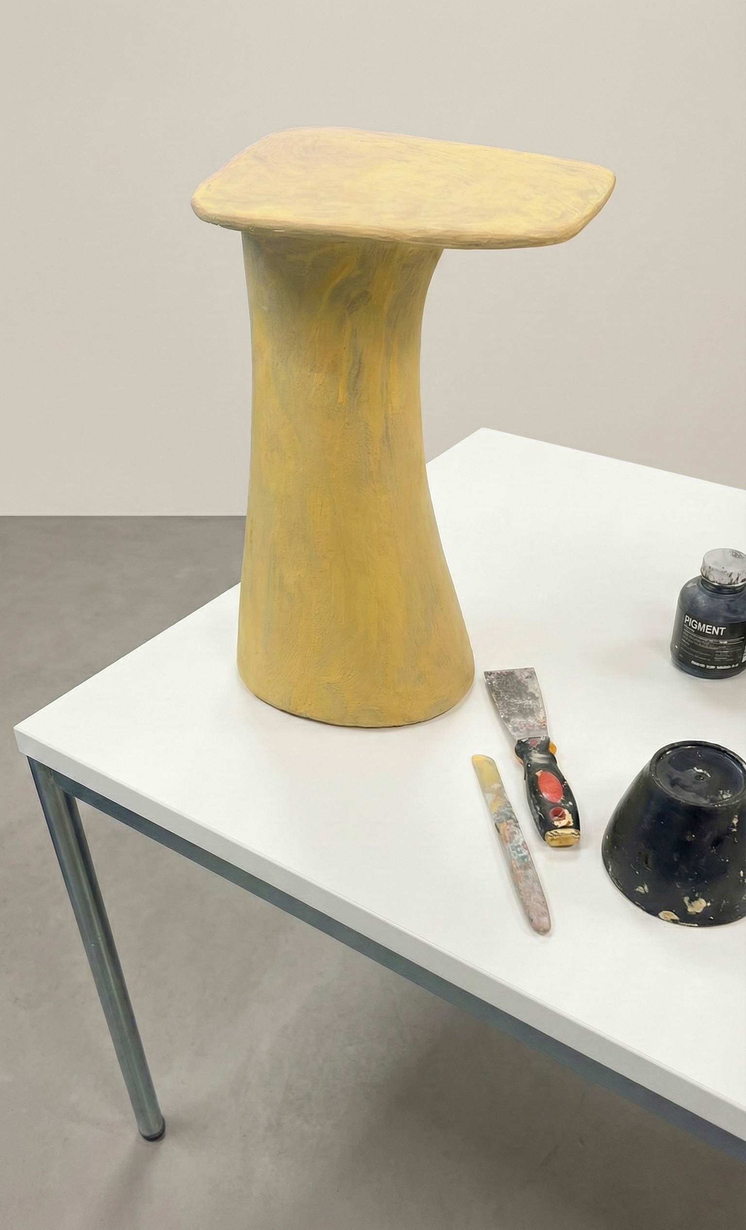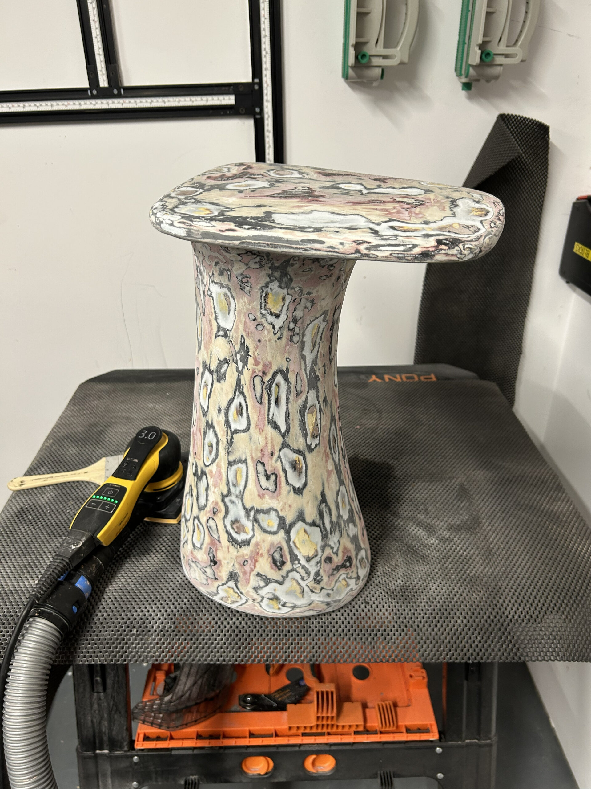 The process begins with sourcing waste paper from industrial and post-consumer streams. Once collected, the material is shredded and softened to remove impurities and prepare it for reformulation. The processed fibres are then combined with natural or biodegradable binders and shaped into a strong, versatile biocomposite used to sculpt the pieces.